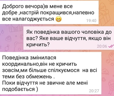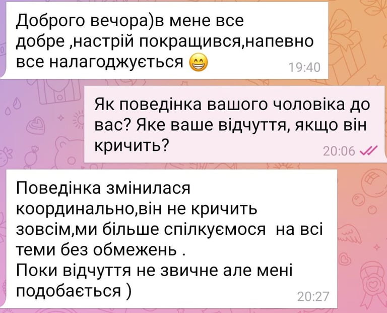 Після нашого сеансу чоловік перестав кричати. У нього більше не було потреби віддзеркалювати внутрішній конфлікт з чоловічою статтю у своєї дружини. Збиралися всією родиною, у клієнтки не виникало потреби захищати маму, вона взагалі не бачила жодної провокації зі сторони свекра.